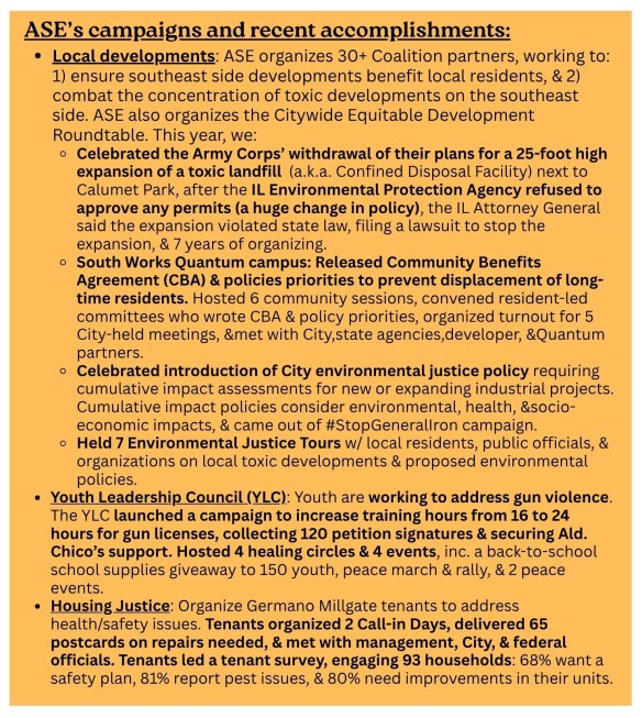In the last 2 months (Sept. to Oct. 2025), ASE has organized around the ground-breaking at the massive $1+ billion, 400-acre South Works development, supported a rapid response team on a series of ICE activities on the southeast side, and moved environmental justice policies, while facing an unprecedented cuts in funding.
