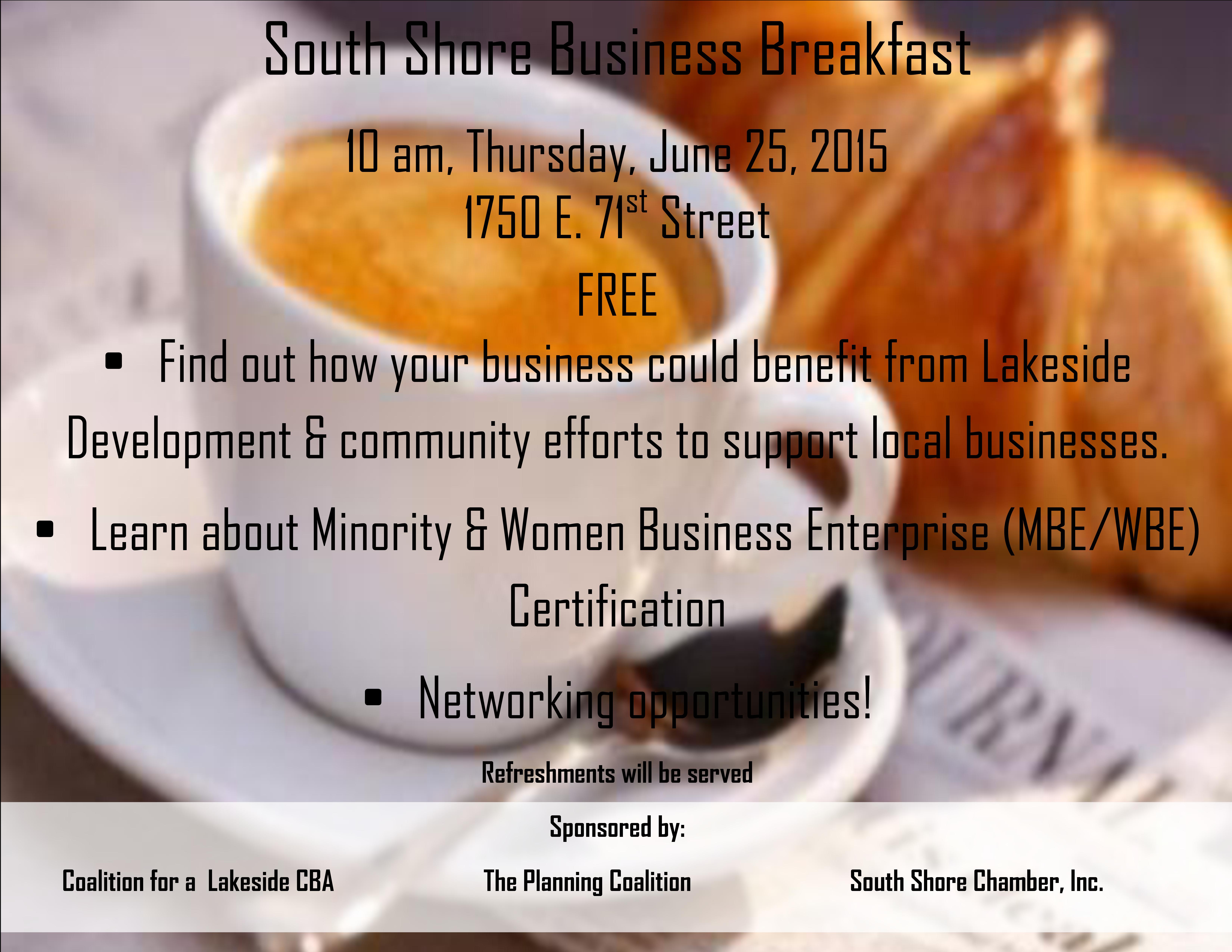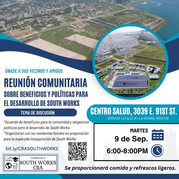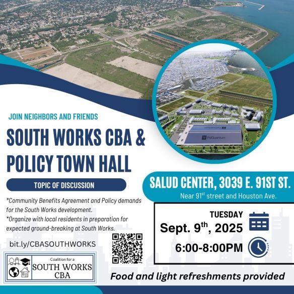 Coalition for a Lakeside CBA wants a CBA, a written agreement with Developer Daniel McCaffery to ensure that Lakeside benefits surrounding neighborhoods. For more information, please contact Amalia at 773-800-0322.