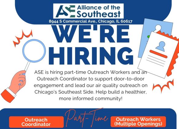 The Alliance of the Southeast (ASE) is seeking four dedicated and energetic Environmental Justice Outreach Workers. Team members will engage directly with Southeast Side residents about local air quality concerns, provide information about an local air monitoring program, and help build community power around environmental justice issues. This position offers an opportunity to make a meaningful impact in communities disproportionately affected by industrial pollution.